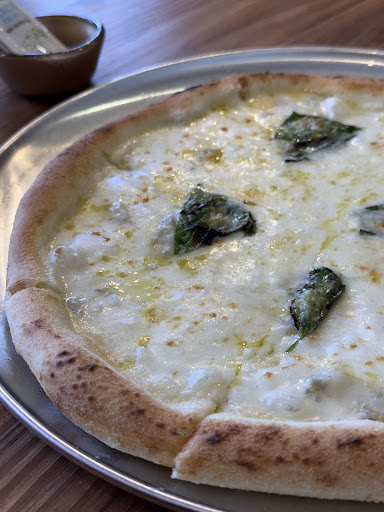・4種のチーズピザ(ゴルゴンゾーラ入り) は、ブルーチーズの香りがクセになる濃厚な味。チーズ好きにはたまりません!ゴルゴンゾーラなしも選べるので、好みに合わせて注文できます。
