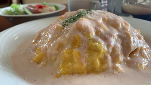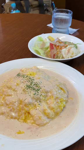 Read more車で走っているとオシャレなカフェを発見‼️🚙💨💨 ランチタイムでしたのでお邪魔してみました😊 ハンバーグやパスタが得意そうなお店ですね〜✨ ても、週替わりであろう「今週のランチ」にオムライス発見🤩✨ 『明太子クリームソースオムライス』1080円 『ライス大盛り』100円 を注文✨ ドリンクバー、サラダ、デザートが付いてこのお値段はお値打ちかも🤗 ドリンクバーにはスープもあります✨ 明太子の風味がたっぷり感じるクリーミーなソース😆🙌 具材ははいってなくシンプルなタイプ🙄 ケチャップライスは色合いほど味の主張は無く、ソースの旨味を余すことなく伝えますね😄👍 食後はデザートと共にドリンクバーでコーヒーお代わりしつつ、まったりとした時間を過ごせました😊☕️🍰 女子ウケしそうなお店ですが、コロナの影響か悪天候からか、落ち着いてましたよ〜🥺💧...