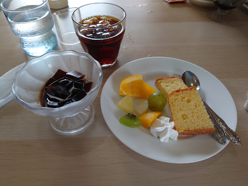 デザートがまた最高でワンプレートにパウンドケーキとフルーツ🍰🍍🍊🥝🍑そして別皿にゼリーとデザートだけでも豪華✨ドリンクバーのアイスコーヒーと共にいただきました😋