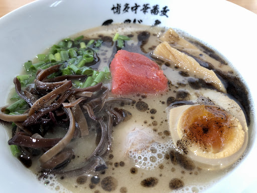 をいただきました。 写真のように黒マー油豚骨ろびんスペシャル芸術です〜 とても美しい。 チャーシューが3枚も入っている。 この値段で明太子入れちゃう。 紅生姜と高菜小分けで提供〜原価高すぎじゃないかと利益を心配してしまう。 明太子をレンゲ上でほぐしながらスープに絡めて飲むと幸せな気分になりました。 焦がしニンニクは良いのですがもう少し豚骨濃度を上げると嬉しいかもです。星5。