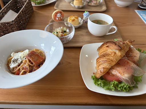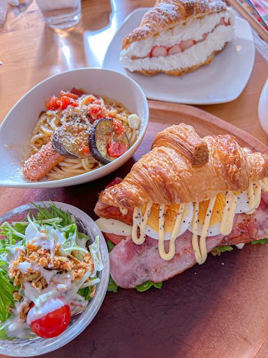 A friend of mine found this place and wanted to check it out so I tagged along. We waited to be seated since we also have tiny humans with us, ended up with two tables. They have a wide variety of selections from breakfast, lunch and dinner. I ended up getting the lunch plate: BLTE croissant, arabiata pasta, a side of salad and orange juice for Â¥1280. Also got a strawberry croissant for dessert and my friend got the 3 decker strawberry pancakes. Everything was superb! ððœ Servers were very accommodating. It was worth the drive, the wait and the money! I canât...