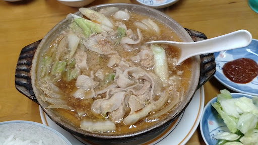 肉鍋定食(¥800)を頂きました。 懐かしさを覚える様な、家庭の味といった感じの熱々の肉鍋にどんぶり飯がドーン! ヨーグルトとリンゴのサラダに浅漬。めっちゃ旨いし、このボリュームでこのお値段ホントありがたい。