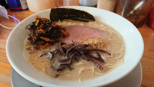 Read more本日が2回目の来店。 前回はこってりラーメン食べたのですが、今回は気になっていたとんこつラーメンを注文しました。 注文は食券を買うタイプでした。 お水はセルフ。 祝日ということもあり、店内は満席近い来客でした。 若い方が多く、人気が伺えます。 本場、博多のとんこつラーメンは食べたことはないのですが、卓上にはたくさんの味を変える調味料が。 にんにく、紅生姜、すりごま、とんこつスープ醤油、辛子高菜などなど、、、。すごく豊富です。 今回はとんこつラーメン、麺バリカタで味玉をトッピング。 スープから一口。うまい。 青森市内であまりとんこつラーメンを食べれるところがないのでそう感じるだけかもしれないですが、色々なラーメンを食べてきた中でもうまい。と率直に出る味です。 一人前をぺろりとたいらげ、ランチタイムには替え玉1つサービスもあります。 なんとも嬉しいサービスです。 チャーシューの美味しさ、それに加えて、スープの味変用の辛子高菜が美味しい。 替え玉入れてからは味を変えるのをお勧めします。すりごまたくさん入れて、紅生姜、辛子高菜の組み合わせはもう最高。 味玉も中がトロトロ半熟で味もしっかり染みてる。 久々ラーメンで満足いくお店に出会いました。