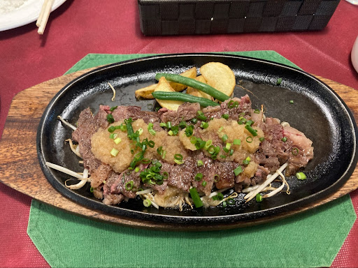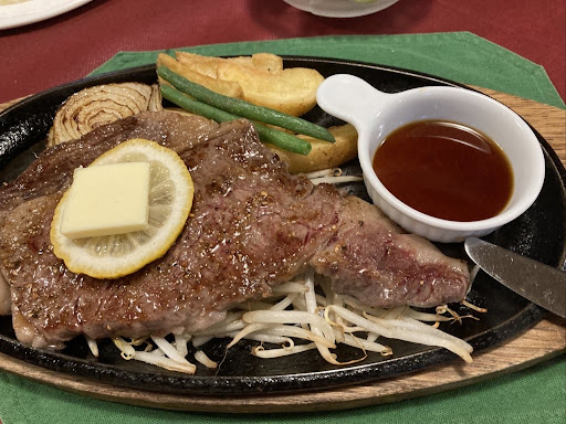 Read more2025.7 和風ステーキが大根おろしで、サーロインステーキがバターと別盛りソースです。 私は和風ステーキを食べました。大根おろしのソースだけを食べてみるとレモンぽい風味がして複雑なのに実に美味しいお味で、それが脂の乗ったお肉と合わさるとなんとも表現できない美味しさになるのです。 アイスコーヒーもスッキリなのにしっかり濃くて美味しかったです。 ちなみに私は、肉は「なんちゃら牛(グラム700〜2000くらいのもの)」を買ってきて自分で塩コショウで焼けば大体美味しいと思ってましたが、大間違いでした。脂の乗ったお肉ほど上にかけるソースで何段階も味が上がると気づかされました。 本当に美...
