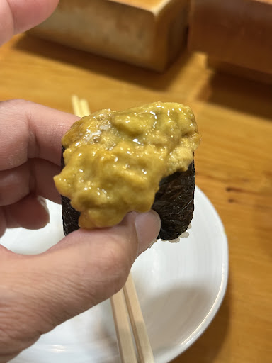 Read moreUn lundi soir un peu morose, j'ouvre la porte de ce restaurant pour tomber nez à nez avec un couple de personnes âgées taillé pour le métier de restaurateur en sushis, seul dans leur établissement au moment de ma venue. Il n'y a que deux choix de menu, ce qui est bon signe, j'opte pour le moins cher des deux, à 2000 yens, en m'assurant au préalable que de l'oursin me sera bien servi. Les gestes de l'homme sont sûrs et les manières de la femme rassurantes, je me sens à l'aise même si le lieu est d'un silence olympien (hormis la tv qui diffuse les infos à un volume très faible) et que les gérants n'ont visiblement pas l'habitude d'accueillir des étrangers. Les sushis sont succulents, il n'y a pas de mots qui conviennent mieux. Je suis si impressionné par l'aura de mon plat que je n'ose sortir plan téléphone pour le prendre en photo de peur de briser une partie des arômes en changeant mon angle de vue. Un très bon lundi...