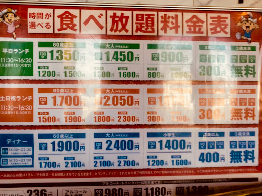 Tại đây có thể ăn ngon no nê mà không cần lo về giá nếu bạn đi vào ngày thường thì giờ ăn rẻ nhất làn 11:30h -16:30h nhưng vì để cbi cho ca tối thì từ 15h sẽ không nhận ca trưa nữa.mức giá cho người lớn(大人) dưới 60 tuổi phù hợp với mọi người.giờ ăn có thể lựa chọn thoải mái nhưng thường thì không tốn nhiều thời gian vì đồ mình tự đi lấy.có thể không chọn nước uống vì ở đây có nước sôi ,trà,trà sữa.đô ăn phong phú đa dạng có đồ đã được chuẩn bị sẵn chỉ việc ăn.ví du như cánh gà chiên mắm,mì ý ,takoyaki,ouden,rau củ,tự làm kẹo bông....đặc biệt ở đây có sushi bạn ăn thoải mái.nếu có cơ hội hãy đến đây trai nghiệm ăn thử nhé.đi qua đây có tuyến xe buýt ngay trước cửa quán luôn.nếu đi taxi từ shiyakusho tới cũng mất chỉ 1sen 400yen thôi.Chúc các bạn ngon miệng có những trải...