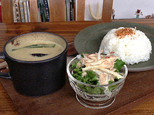 食事メニューはココナツカレーのみ(880円)で、ランチタイム(12:00-15:00)は980円で飲み物付きにできます。 カレーの具として見えたのは、チキン、キノコ、オクラ、パプリカ、なす、でした。