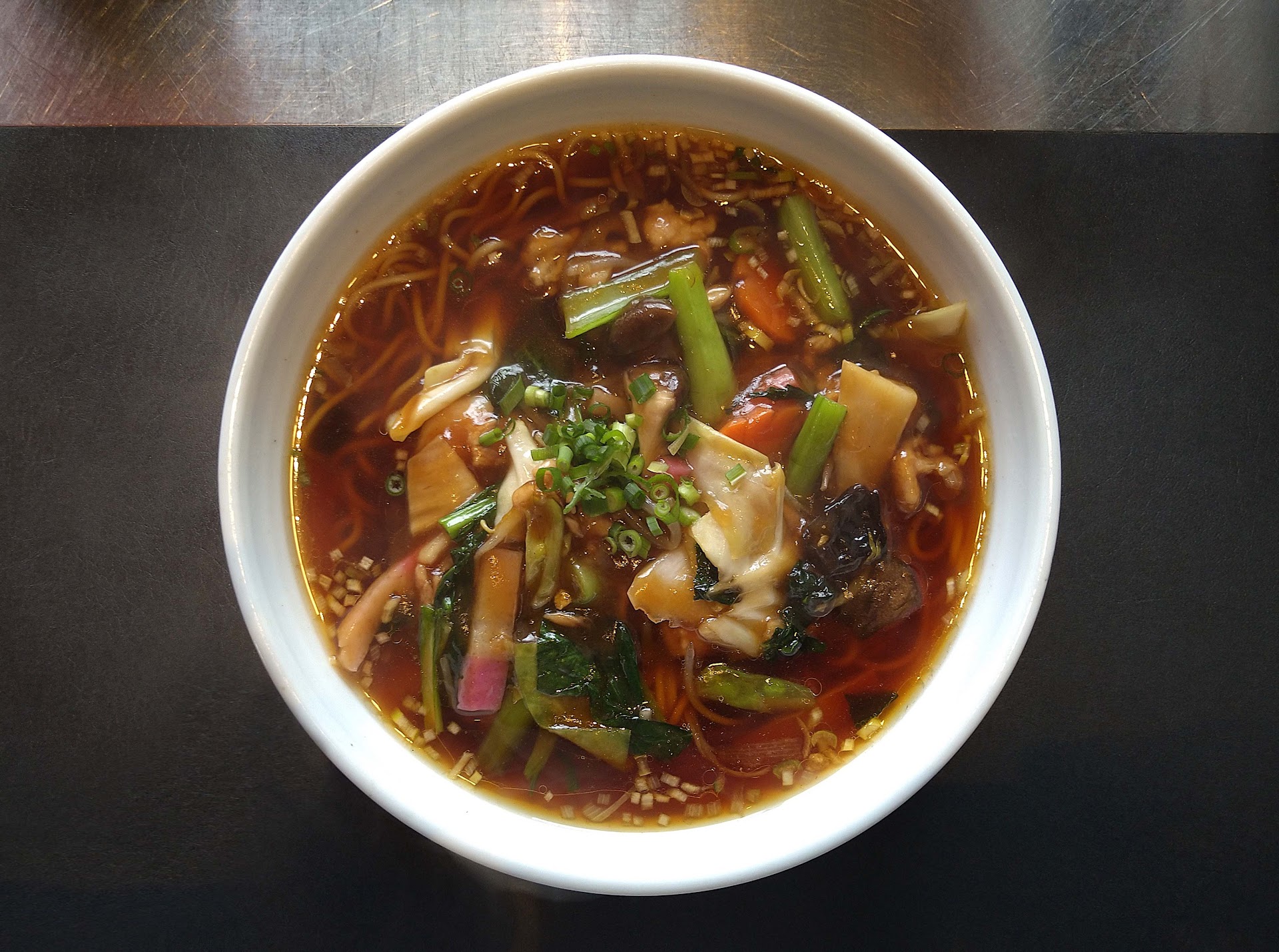 Read more熊本県荒尾市下井手、熊本県道314号線沿いにある中華料理店です。「グリーンスマイル一番館」の西側エリアの中程にお店はあります。割と大きめの店舗で、店内はテーブル席を中心に、小上がり席も用意されています。また、注文は各テーブル毎に設置されているタブレット端末で行います。駐車場は集合店舗の共用駐車場がかなり広めに取られているので心配はないでしょう。さてラーメンですが、こちらの麺類筆頭メニューは「五目中華そば」となっています。甘みと微かな酸味のバランスの良い濃厚な醤油系スープとなっています。麺はストレート中細麺が使用されています。具は豚肉、蒲鉾、白菜、青梗菜、人参、輪切り蓮根、イカ、エビ、しめじ、ワカメ、キクラゲ、刻みネギといった具だくさんな一杯です。大盛り対応なし、替え玉制なしとなっています。今回はふつうサイズをオーダーしましたが、通常の大盛り程度のボリュームがありました。その他の麺類は「担々麺」「酸辣湯麺」「長崎パリパリ皿うどん」「五目あんかけ焼きそば」が用意されています。その他のメニューは中華料理店としてそれなりに豊富なメニューが展開されており、一品料理については三段階のサイズが用意されており、ニーズに合わせて便利な選び方が出来るようになっています。また定食やコースメニューも複数用意されており、目にも楽しませてくれるメニュー表となっています。因みに、今回はお供に「王道の五目炒飯」をハーフサイズで頂いたのですが、こちらも通常の並盛り程のボリュームでした。価格だけ見ると、全体的に割高感はあったのですが、このボリュームで考えると納得です。 こちらのお店は、2013年頃に現在の場所から500m程東に進んだ場所(現「ざしき笑し」の場所)で開業されています。2018年8月には「グリーンスマイル一番館」内の中華料理店「龍と虎」跡地に移転され、現在に至ります。因みに中国語風の不思議な屋号ですが、オーナーシェフの三人のお子さんの名前から1字ず...