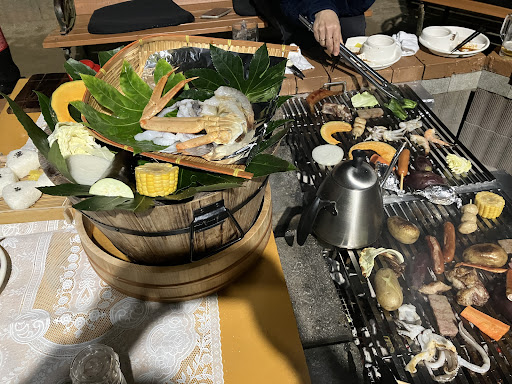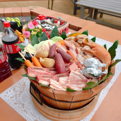 料理は牛豚鶏、野菜やおにぎり、焼きそばなど ドリンクはノンアル、アルコール共に種類が豊富でお肉はどれもとても美味しかったです☺️ 焼き芋や骨付きソーセージ、鶏の丸焼きなどインパクトのある料理もあり、それでいて安価でとても満足のいくBBQとなりました✨