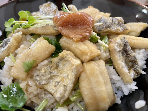 太刀魚はいったん揚げてから、タレに潜らせ、白米に乗せられています。油で揚げて、甘辛い醤油ダレで味付けられているのに、とっても淡く優しいお味でした。確かに太刀魚という素材の美味しさを、十分引き出せていると感じます。意外と、丼の真ん中に乗っている梅干しと、太刀魚の相性が良いのにも驚きました。