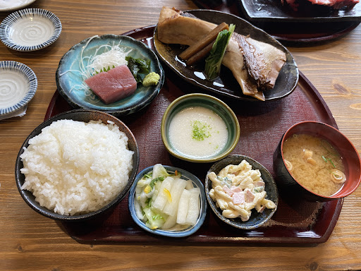 メニューを見ると、海鮮丼や唐揚げ定食やら豊富な品揃えやなと、ただしマグロ系のランチは3種類売り切れですとの事。 私がマグロ満足定食の御飯大盛(+100円)、友人が中落ち定食を注文。 マグロのカマの部分がかなり大きく、しっかりと肉が付いていました。 味付けは、煮付けにしては少し薄味かなと言う程度ですが、もう少し甘めの方が個人的には好きかなと言う感じでした。 刺身は臭みもなく美味しかったですが、一言だけ言わせていただきたい。ブロックやんけ‼️(褒め言葉) 写真はありませんが、中落ち定食の方もデカい骨と皮目が付いており、結構な身が取れていました。 しっかりと脂がのっており美味しかったとの事でした。 近所に行った際には、また行こうと思います。
