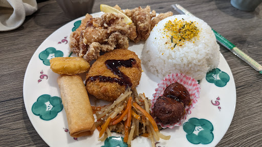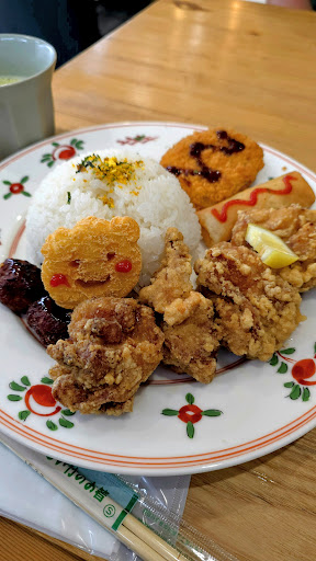 The set meals came with an impressive number of side dishes and a giant pile of rice. My instinct was to want more chicken, because they were fantastic - crispy outside, juicy inside - but everything else was great, too. Meatballs, a spring roll, a potato croquette, and kinpira rounded out the plate. The smiley fry was a...