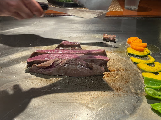 Read more【インパクトあります】シェフが厳選した但馬牛の希少部位を目の前の鉄板で焼いてくれるお店。ちょうど後の脚のモモのところのヒウチのタタキは、お肉の味が、しっかりしているのと、炙り具合といい中のレア感といい最高に美味しい……!!!。 作り置きは、いっさいしない。 オーダー入った時点で作るので、まだほんのり温かいです。 メインのお肉が、肩ロースの中の中心部、ハネシタと後ろ脚の大腿骨の周りに付いている[マルカワ]っていう非常に味の濃い赤身。 柔らかく、きめ細かい赤身肉はヒマラヤの岩塩で頂きます。そのお味は、肉の旨味がジュワ~ときて肉食べてるって感じです。 また、最高級の霜降りロース肉[ハネシタ]は、脂の均等なのり具合、食感が全然違いは……!!!!!。 一瞬でとろけて、脂がすごく甘いです。周りをカリッって焼いた、中のジューシーさを閉じ込める焼き具合が、まぁ凄い絶妙でめちゃくちゃ美味しいです……!!!!!。 そして〆は、お肉の味を染み込んだ[もやし炒め]を、ご飯の上に載せて肉も載せればステーキ丼に。そして、特製の味噌ダレをかければ贅沢なステーキ丼です。 こんなに、もやしが美味しいと思うのは初めてですよ……。 きっと忘れられな...