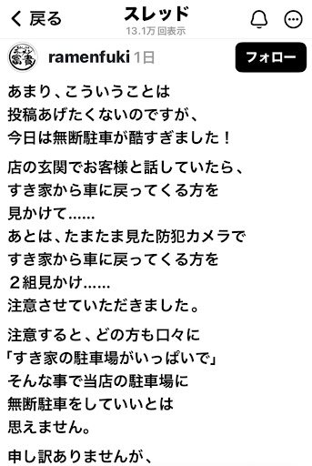 Read more『電話を貸して』と炎天下の中、背中にリュックを背負いながら松葉杖をついたお客さんが来店されたみたいですね。 でも、店員は『電話はないです』と見え見えの嘘を吐いて門前払いをしたみたいですね。すき家の店員の肩書きの前に 『人間として』それはどうなんでしょう??そちらの事情もあるかもしれませんが、炎天下の中、松葉杖を付いて助けを求めていたのに… クチコミを見てる皆さん、人間性が終わってる店員が存在する店舗に行くか行かないか...