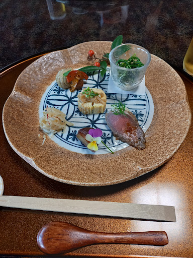 数日前に予約して、友達と行きました。玄関を開けたら、靴箱に名前が書いてあって驚きました。靴を脱ぎ、店員さんに案内されて、部屋に入りました。まるで京都に行ったかのようなお庭が見える素敵なお部屋でした。個室で床の間にも生花があるテーブル席でした。ただ、部屋のすみにある低めの屏風の絵柄が菖蒲だったのと音楽が日本料理店に合わないのが残念でした。 できれば、春夏秋冬にあった屏風とお琴などのバックミュージックがあれば 良かったなぁ~と思いました。 料理は、お年寄りでも食べやすい大きさの一口サイズの前菜から始まり、茶碗蒸しも焼き魚なども美味しかったです。金額は、一番安い3,500円のコース料理でしたが、消費税が別なので、食後の飲み物(珈琲か紅茶やソフトドリンク)は別料金ではなく、コース料理に含...