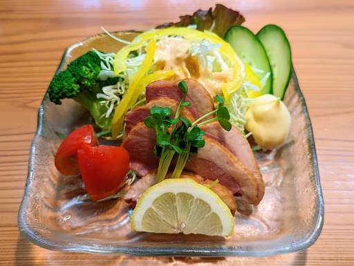 店前の駐車場に車を駐めて店内へ🚶♂️ カウンターに座りメニューをチェック👀 せいろ、サラダ、焼きの鴨料理オンリーで注文🦆 まずはサラダから食べ始めます(´~`) フレッシュでシャキシャキ野菜にスモーキーな鴨の風味が良いですね🦆🥗