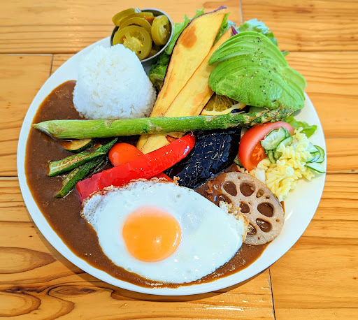 ベジタブルカレー、ライス少なめ 目玉焼き、アボカド、ハラペーニョ ハーブティー