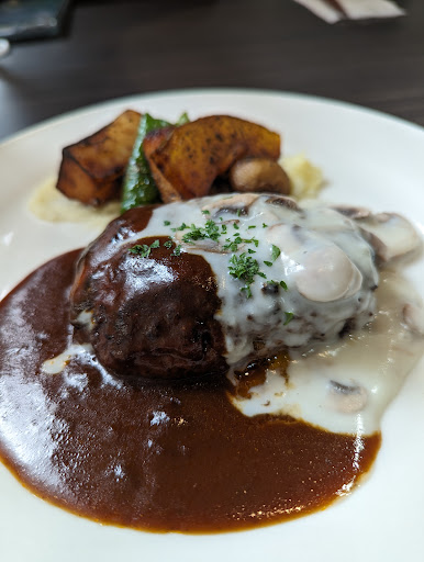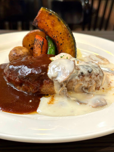 ハンバーグですが、小さいけど美味しいと思います。ただ、ソースがぬるい。 デミとホワイトソースですが、ホワイトソースのミルク臭さが取れて無いです。トロミの有るぬるい牛乳です。 デミソースは塩分多め。 どちらのソースも皿に流れてる部分はぬるいより冷たい。 付け合わせの焼いた野菜の下にマッシュポテトを引いて有るけど冷たいです。 コレにご飯やサラダをつけるとプラス500円ほどかかります。
