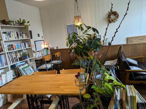 店内は雑貨や衣類、焼き菓子の販売、そして本がたくさん! おそらく普通の住宅をリノベした造りだと思うので(違うかもですが!)そこまで広くないですがどこを見ても飽きないくらい色んなものが散りばめられていて楽しいです。 大きな席がないので、1人から2人での来店が良いと思います。 本のジャンルも様々で、雑誌、漫画、エッセイ、新書、画集、絵本、小説…etc… 1人で来たらすごく長居してしまいそう。