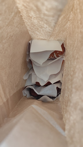 ドーナツを選んだあとは、紙袋(無料)か箱を選びます。パンも買われる場合は、マイバッグを出すとまとめて詰めてくれます。
