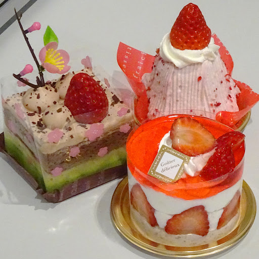 いやあどれもカワイイ、きれい、美味しそう!迷うほどの種類があり、どれもステキに見える。 選んだのは「プレミアム苺フレジェ」626円、「桃の節句チョコショート」216円、「苺と白桃のモンブラン」421円。 どれも丁寧に作られてました。そそる見た目。