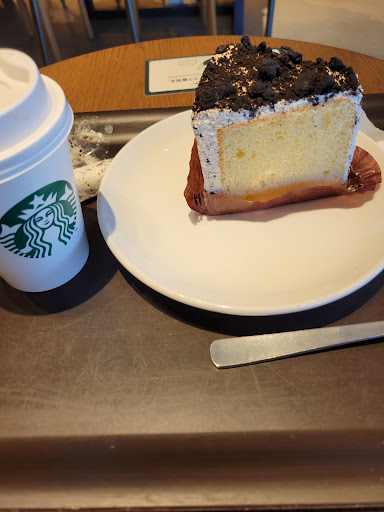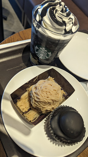 いつもはドライブスルーでのみ利用でしたが、初めて中に入りました。 店内もとっても綺麗で、レジ担当してくれた女性スタッフの方がとても感じの良い方でした。 初めての店内で、ショーケースに入っているオシャレな食べ物を見て母と【あれも美味しそう!これも美味しそう!!】と目移りし、なかなか決まらず騒いで居ましたが、にこやかに、優しい雰囲気で待って下さって、会計時迷ってしまい時間がかかったことを謝ると【食欲の秋ですからね!どれも美味しそうで迷っちゃいますよね!!】ととびきりの笑顔で対応して下さいました。 一人がけの外を向いたゆったり椅子の席もあって、1面ガラス張りの店内からは気持ちの良い青空が見えていました。 駐車場の車とご対面状態で道路側に向いて座る形ですが、手前には緑が植えられていて、不思議と落ち着く空間になっていて驚きました。 ハロウィンの黒いフラペチーノと黒いケーキ、モンブランを購入。 Boooooフラペチーノは見た目衝撃的ですが、シナモンの香りやキャラメルの香ばしい甘さがスタバ特有のストローの差し込む位置で味の変化を楽しむことが出来て、美味しく頂きました。 真っ黒ケーキの中には甘酸っぱい紫色のムースでサッパリとして美味。 モンブランもと...