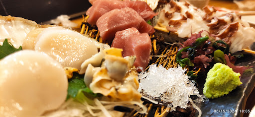 Sushi, sashimi, tempura & bento boxes, plus sake & shochu, in a minimalist bar with low tables.