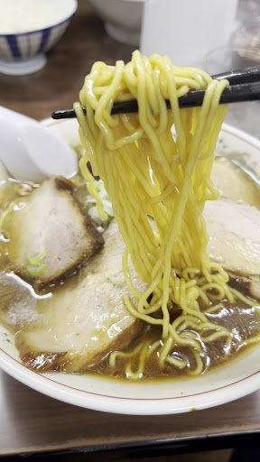 麺はどん感じかな。 持ち上げると細めちぢれたまご麺かな? すすってみると、うん!うまい! 麺の味もさながら、スープに絡んで相性がいい! このスープと麺のバランスの良さは久しぶり! とズルズル進む。