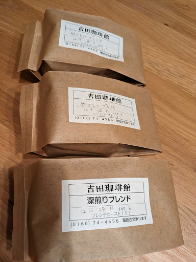 Read moreずーっと気になっていたお店。 初めて伺いました。 入ると店員さんは40代位の女性です。あれっ?てっきり吉田さんって言うおじさんがやってる店だと思っていました❢と話していると、そうなんですと。 前オーナーは吉田さんっておじさんだったけれど、体調の事などあり辞める事になって、もともと知り合いだった今のオーナーさんご夫婦が引き継いだそうです。 なので口コミに出ているカフェで頂くメニューとは少し変わり、パンやケーキ類は今の所はなくコーヒーのみとなっていました。 レジまわりに、ナッツ類やロアカーのウエハースなどは売っています。 コーヒー豆はブレンド系は、焙煎して調合されているのですぐ購入でき、単品のコーヒー豆は、機械で10分位で焙煎出来るそうです。 その間席に座って待てます。 カフェとして捉えて行くよりも、コーヒー豆専門店で、その場でも頂けるお店のような感覚がよいかもです。 単品の豆がかなり種類あり、好みなど相談すると、より自分の好きな味を楽しめそうです。深入り好きな私はその場で頂くのは、マンデリンと悩みましたが、マンデリンはよく飲むので、ワンランク軽いコロンビアのカフェドルチェを。 持ち帰りで自宅用には深入りブレンド。知り合いのクリスマスちょこっとギフトには新発売で幅広く飲みやすくブレンドよりいい豆と言う、「優しいブレンド」を2つお願いしました。 400グラム以上で、市内の近郊ならば無料配達もしてくれるそうです。 風味豊かな美味しいコーヒーでしたが、最近冷えるので、熱めのコーヒーばかり飲みなれていた私には、ちょっとコーヒーの温度がかなりぬるく感じました。 コーヒーの豆の味をしっかり楽しむ適温は、本当はお湯は熱々じゃないんでしょうね〜。 次に冬場にイートインする時は、少し熱めが好きですとお願いする事にします。そんな我儘なお願いでも気軽に相談してしまえるような、素敵なお店&人...