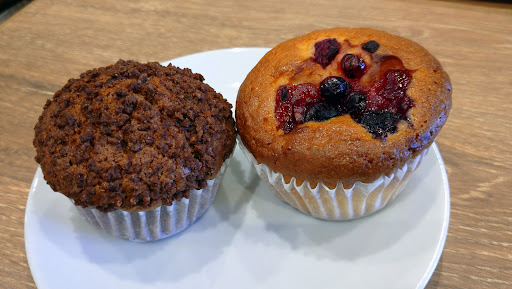 カインズ朝霞店さん1Fにあるイトーヨーカドーさんに向かう通路を歩いていたらカフェがあったのでイートインで伺いました。マフィンを2つ注文したら「3つ購入すると30円引きになります。」と言われましたので、ブリッコさんは初めてなので試しにと思いベリーベリー、チョコバナナ、プレーンの3つとブレンドコーヒー(ホット)を注文しました。カインズさんの系列店なのでカインズさんのポイントカード(アプリ)が利用できます。