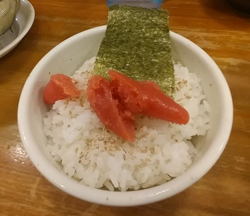 ラーメン味玉トッピングと産地直送明太子丼を注文。明太子丼、メニューを見るとそこそこ小ぶりな明太子が3つご飯の上に乗ってます(だから注文したの)