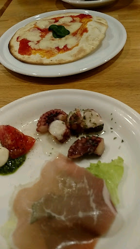 生パスタは変わらずモチモチで美味しい。 ハーフの量もちょうど良き。700円ほどの値段は致し方ないか。2種類とも1人が食べることは想定されていないかもしれません笑。 ピザは以前と違い窯焼きピザ! 耳もふかふかもっちり、ジューシー生地で美味しい。 ハーフアンドハーフをさらに切り分けて1人で半分の量を食べました。