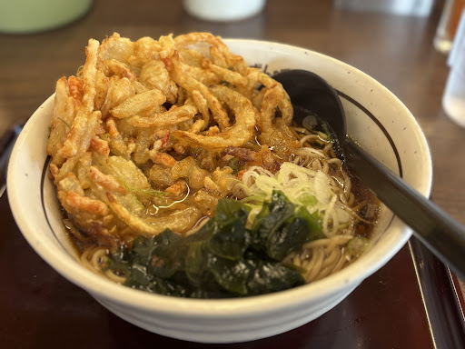 さて、カウンター席に座りメニューを見て店員さんにオーダー。やっぱり悩んでの天ぷら蕎麦640円です。普通で言うかき揚げ蕎麦。価格はお財布に優しい。 程なく着丼。 出汁は関東風、醤油と鰹ベース濃い出汁が美味しい。 蕎麦はもっちり感がある細めの面。出汁と合います。 かき揚げはボリューミー。 全体的に食堂感のあるお店の雰囲気で、メニューも同様。 お会計はレシートでセルフ。