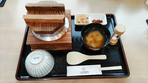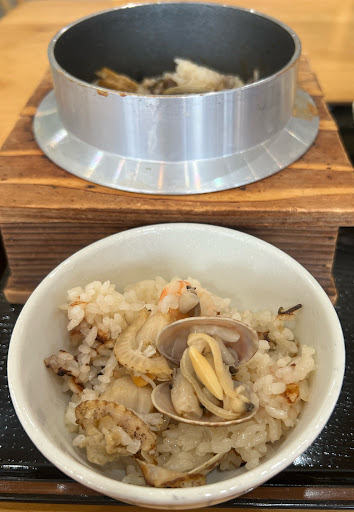 Read more以前、寄島かき直売所の帰りに『かきめし』の旗を見て入店。その時は1人だったのでテイクアウトでした。…今回は奥さんと入店しました。 共に『かき釜めし』をオーダー…15分程で到着です。砂時計⌛️が落ち切ったら釜の蓋を開けて混ぜていただきます。小さな茶碗に三杯の量があり、牡蠣飯の味も美味しくて特に【おこげ】は最高〜‼️ヽ(`▽´)/ 食後にはセルフでのコーヒーも付いていて、大満足しましたよ〜‼️👍 他にお客さんがいなかったので窓側カウンター席に座れたのはラッキーでした。🙂