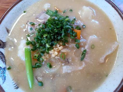 福岡県では珍しいだご汁を食べられるお店です。元来だご汁(という呼び名)は熊本県の郷土料理で、大分県ではだんご状の塊ではなく、平べったい麺状になる。福岡県でも熊本県に近い山間部の一部地域でのみ食べられていたらしい。無論、筑後平野の真ん中のこの地域の食文化ではない。店に関わる何方かが熊本県出身なのかも知れません。店は国道沿いにあり、道の駅原鶴の直ぐ近く、ローソンの隣にあるので解りやすいです。 日曜日の昼過ぎに行きました。店内は満席でしたが、運良く直ぐにテーブル席が空いたので、待つ事もなく座れました。お茶、水はセルフサービスです。店内はお座敷が4卓、テーブル席が3卓程度のこじんまりしたお店です。かなりバタバタしている様で、なかなかメニューを持って来て貰えませんでした。色々セットが付いた定食もありましたが、肝心のだご汁が1/2サイズになるので、単品で頼みました。珍しいのはだご汁が豚、かしわ、山菜等選べる点です。鶏好きなのでかしわだご汁大盛(普通¥700-プラス¥200-)を頼みました。約10分程度で提供されました。田舎味噌でしょうか、味が濃く私好みの味です。野菜はかなり細かく刻まれています。椎茸、人参、ネギ、白菜、茄子、そして塊状の団子が10個位入ってました。丼一杯のボリュームです。食の細い方は普通サイズの方が良さそうです。かしわはモモ肉が柔らかく煮込まれており、良い味になっています。風味付けの生姜も良い感じ。一味唐辛子もあるので、辛いのがお好きな方はどうぞ。接客はいかにも「田舎のおばちゃんが手伝いに来てる」みたいな雰囲気なので、愛想が無いというかなんと言うか... はやい話がぶっきらぼうな感じですが、嫌味はありません。 この味で普通サイズ¥700-は至極妥当な価格でしょう。リピートしたい味でした。駐車場はローソンと共用で、30台は停められます。因みに此処はだご汁だけではなく、カレーライスやカツ丼、麺...