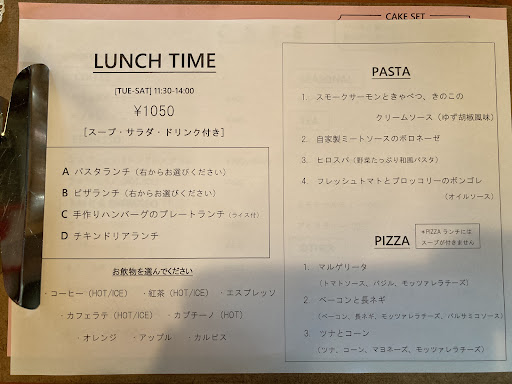 Read more夏休み、秋月までランチドライブに。あいにく食事出来るお店がほとんどなく、ネット検索で見つけて訪問。駐車場は広くて舗装されていて良かったです。お店は懐かしい昭和の喫茶店の雰囲気を残した、心落ち着く空間でした。ランチコース¥1980を3人前オーダー。メインはパスタ、ピザ、チキングラタンを頼みましたが、それぞれ逸品でした。セットのケーキ🍰もボリューミー^_^今日も美味しい食事をいただけ、感謝です。ご馳走様でした。 既に他の方も書かれていますが、オーダー、配膳、レジ担当女性は、笑顔なく、もった...