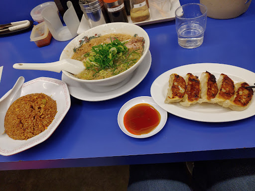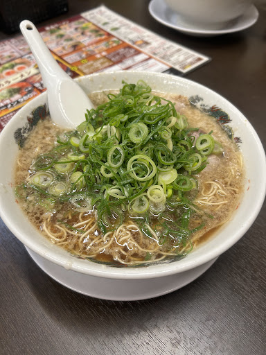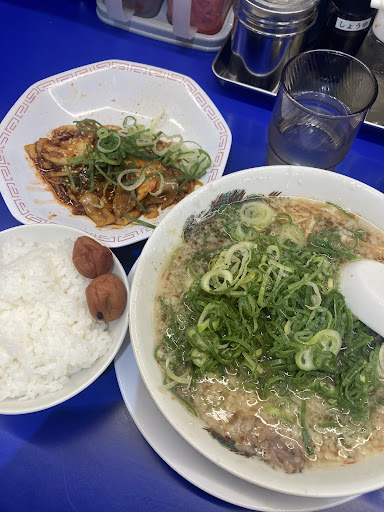 朝倉市一木、福岡県道8号線沿いにあるラーメン屋です。大きめの店舗ですが、店内はカウンター席15脚と6人掛けボックステーブル席5卓の構成です。駐車場は周辺の店舗と共用で、かなり広めに取られています。注文は各テーブルに置かれたタブレット端末で行います。さて「ラーメン」ですが、基本は「背脂醤油味」となっています。甘くまったりとした鶏ガラ醤油系スープの表面は多量の背脂に覆われており、当然の事ながら油感は強めです。麺はストレート細麺が使用されています。固さのオーダーは可能ですが、固麺でも長浜系ラーメンのようなザクザク感はありません。具は薄切りの柔らかチャーシュー、メンマ、ネギといった構成の一杯です。最近、グループ全体で味のテコ入れがあったようで、塩辛さより甘さの方が引き立つようになりました(2025年夏現在)。大盛り対応あり、替え玉制なし、各種トッピング対応ありとなっています。ラーメンのオーダーの際には背脂の量、醤油の濃さ、麺の固さ、ネギの量等が調整出来るので好みの一杯を作ってみましょう。因みにノーマル設定のままでも既にこってり甘じょっぱい印象です。ラーメンのバリエーションは「味噌味」「塩味」「こってり味(とんこつ醤油)」等が用意されており、更にトッピング違いの数種類や季節限定のラーメン等も合わせて、数多くのメニュー展開が特徴となっています。また「チャーハン」「唐揚げ」「天津飯」「餃子」等といったサイドメニューも豊富にあり、更にこれらを絡めた定食類が多数用意されています。今回は「がっつり定食」で「半チャーハン」と「餃子」を頂きました。「半チャーハン」は焦茶色で味濃そうな見た目なのですが、至って普通の味付けでした。「餃子」の方は餡がみっちり詰まっていて食べ応えがあります。また全店舗で「梅干し」が販売されており、各テーブルにも置かれているので、興味のある方は試してみて下さい。 「来来亭」は滋賀県に本店を置く、全国チェーン展開されている京都系鶏ガラ醤油ラーメン店です。ここ甘木インター店は2014年に開業しており、周辺からのアクセスも良く見付けやすい大きな店舗で、客の入りも良いようです。因みに、カウンターテーブルのコバルトブルーがラーメンに映えて、個人的に...