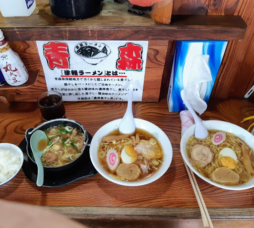 注文は私はもつ煮定食、妻は塩ラーメン。 ご飯の量は多くないと店員さんが言ったので醤油ラーメンも追加した。 順番が来て席に着いたら定食と塩ラーメン、醤油ラーメンが来たがこれとは別に半ラーメンが付いてきていた。 テレビ放送では定食には半ラーメンが付いてきていたが、入り口の店員さんに聞くと半ラーメンは付かないとはっきり言われたのでラーメンを追加したのに!!!(写真は私がたのんだもの) となりの夫婦と同じようなことを言っていた! 放送されていたようなサービスは全くなかった! 奥さんが「食べられる?」と聞いていたがとてもブルーな気持ちになった! 結局は私が定食とラーメンと半ラーメンをたべる羽目になった! 味は津軽ラーメンとはこれである!と言うような特長はなかった! オモウマイ店に出たから行ってみたが放送後の対応や準備不足が目立った!
