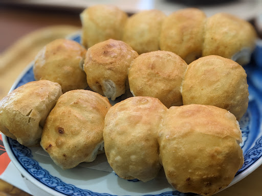 分厚い皮に入った何かに餃子のタレを付けて食べた→食べ終わった後はとりあえずお腹いっぱい