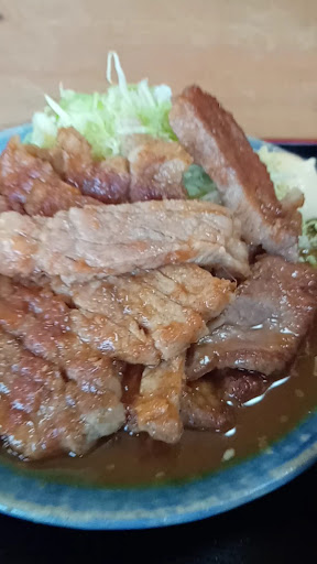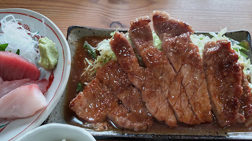 Read more・R6.5.27食べたくてでも、間に合わず満席。待たせてもらって入れてもらった しかも、足に優しいテーブル席。店内に初向いて待つ。刺し身生姜焼定食」いつもジュウジュウ聞こえなくて不思議だったが、自分のせいだった。炎と音🤤帰りマスターも出てきて挨拶、ありがとうございました🙇生姜汁迄完食です。 ・R6.5.21仕事で疲れましたし、ずーと又食べたいと思っていたので朝から来て近くから申し訳ないけど営業前に電話予約しました。足が悪いのでイス席にして頂きました。あじフライも迷いましたが同じ刺し身生姜焼き定食を注文して来店。 直ぐに着丼。刺し身も5点盛り凄っ。生姜、わさびが有るので小皿2つ出してくれた。ご飯はおかわりはあっと言う間に平らげてしまい。刺し身のツマに生姜汁をかけて最後まで頂きました。 ・R6.4.29生姜焼きの写真が気になり、来店。娘は肉得意ではないけど「通常メニューも出来る時間貰えば」と言われランチメニュー(4月から1100円見たい)「刺し身生姜焼き」肉は見ただけで美味しいのが解る。刺し身もうわあ〰!2〰3枚旨いの食べたいと思っていた所にコレ!😆中トロ、赤身、白身 中落ち、甘海老。娘はトロ駄目なので(私のと)甘海老&赤身交換、ご飯一度おかわりOKだと言うことで、おかわり。肉も味😆柔らか。美味かった。席が少ない小上がり4人掛けが3席。カウンター2席。テーブル4人掛け一席。2人で営業されてるので時間がかかる。そこが、ネックですね。 後マナー悪い方は止めて。いくら子供でも座敷でオナラしてるし。いい体格で家じゃないんだから…。座敷上がる時...