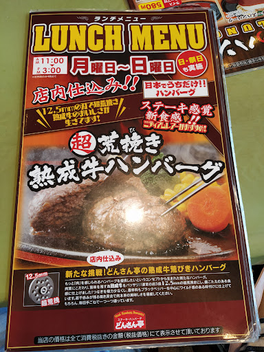 Read more足利市においらのお気に入りの健康ランドがあり、その行く途中こちらがメディアで紹介されてた、地元のステーキ&ハンバーグのご当地チェーン店なので寄って見た、色々変わり種があったんですが、土鍋ハンバーグかどんさん亭セットか迷った結果どんさんに決定、ベーコンを巻いたステーキでして、他ではあまり無い気がします。後ここの売りはセットで頼んだライスは3種類から選べて白米、雑穀米、炊き込みご飯(ひじきときのこ)の中から選べて、オイラは炊き込みにしました。なんか得した気分になりました。ステーキの添え物もにんじんかスパゲティも選べて良心的(*•̀ㅂ•́)و✧ステーキの方は普通でしたwでもソースが二種類あって、酸味の効いたソースは結構酸っぱめでしたねwもう1つは醤油ベースの少し甘めのソース、ステーキにはこちらですね、ハンバーグなら酸味かなと、もし次寄る機会があったら、土鍋ハンバーグ食べたいっすな((≖֊...