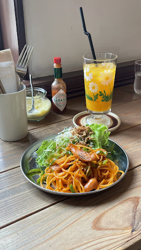 Read moreお食事はナポリタンと時期で替わるメニューのようです。今回は相方がナポリタン、私はソーキそばをいただきました。 ソーキそばは本場、沖縄の味とは異なりますが、出汁が絶妙。スープを飲み干しました。チャーシューもほろほろ!! 量は少なめなので、たっぷり食べたい人はチャーハンもつけられること、ナポリタンも大盛りに出来ることを3回目の来店で気がつきました。写真のナポリタンは大盛りです。でも、デザートとコーヒーをいただくには女性では少なめのランチで丁度良い感じ。 デザートは今回、レモンクリームタルトを、前回、プリンをいただきました。夏に爽やかなレモンクリームタルト。そして、プリンは硬めでカラメルが少し苦い、大人味で、ヒットしました。 また、プリンの時はプリンに合う珈琲を勧めてくださいました。ホット限定で、「なるほど合う!!」と満足でした。 長文になってしまいますが、店内の天井の梁も太くて立派です。お店の雰囲気、そして、温かみのあるお店の方、落ち着けます。ただ、余計なことかも知れませんが、一部、座り心地が硬い椅...