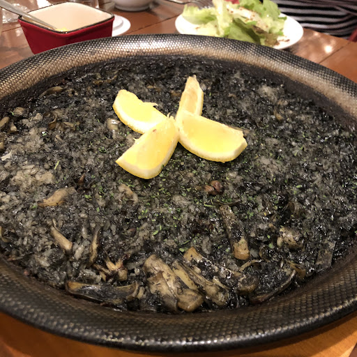 お料理はサラダ、おつまみ、パエリアをオーダー。 柿と春菊のサラダおしゃれ且つ美味、マッシュルームの肉詰めは挽き肉ではなくほぐし肉。挽き肉じゃない肉詰め初めて で、これがまためちゃくちゃ美味しく、マッシュルームも香りたっぷりジューシーで絶品、アヒージョはバケット6枚もありボリューミーでありがたく、イカスミパエリアは香ばしくサッパリ、コクアップ&味変のオリジナルマヨネーズがバッチリ。 チーズの盛り合わせのブルーチーズとハニーの相性抜群で香り最高。