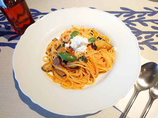 本日のおすすめから注文した “茄子とバジルとリコッタチーズの トマトソース”はトマトのうま味ある 優しい味付けのソースにアルデンテの麺で とても美味しかったです♪ “海老とアスパラガスのトマトソース”も 美味しくいただきました♫