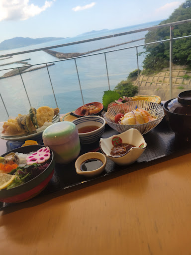 芦屋海浜公園から若松区方面に遠賀川の一番河口の橋を渡ってすぐの高台の上にあります。 連休中で休みの店も多かったので満席かもと心配しつつ席状況を聞くとまだ空きがあったのでとりあえず入店。 響灘と芦屋海岸に面していることから窓側からの眺めはなかなか望めない抜群の眺望。 当然ながら窓側席はほぼ満席。 たまたま空きがあったのでそこに座らせてもらいました。