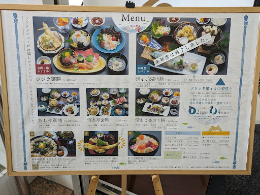 メニューは会席料理から海鮮丼、カレー等そこそこありますが、やはりメニューは海鮮系。 海鮮丼には少し食指が動かなかったので今回は「イカとろろ丼」@1800円と妻は「大海老フライ定食」@1400円を注文。 イカの姿造り御膳はイカが入荷していないとのことなので断念。