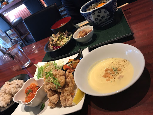 ・日替わりのプレートランチ 鳥の唐揚げ、イカのをトマトで煮た小鉢物、 サラダ、がひとつに盛り込まれたお料理に コーンのポタージュ、雑穀米 がセットになっています。 入店したのがランチタイムギリギリで、 クリームコロッケが売り切れで、 鳥の唐揚げを代わりにいただきました。 揚げたての唐揚げは、ホクホク、熱々、 サクサクで、雑穀米も進みます。 イカの小鉢もトマトの酸味とスライスされた オリーブでさっぱりとしながらも、 旨味があってペロッといただけました。 スープもクリーミーでしっかりとした 味わいでした。