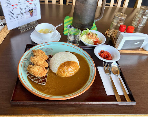 以前は、広い客席全体を見渡せたが、昨年テーブル6卓ほどでブースに仕切ったのだと聞いた。 さて、注文はメニューのカレーゾーンに目が止まり、牡蠣フライカレー・コーンスープ(小)・サラダ(小)を選択した。 ・ 配膳を見て独特の盛付けにビックリ。どデカい皿の真ん中あたりにこんもりとした丸いライスの山、その周りに具なしルーが広がって、半月型フライネットには大きなカキフライ三個が載っている。(以前食べた時の写真と比べたら、フォーマットが全然違った…) ネットリとしたカレールーは幅広いお客さん向けに辛味は殆ど無い。なので、途中でテーブルの一味唐辛子とコショーをブッ掛けてやった。 ・ デカいので一口で食べられない牡蠣フライが旨かったなぁ。これからは牡蠣の時季だから牡蠣蕎麦も食いたいねぇ〜。 時折、優しい甘みのコーンスープやミニサラダでカレー味をリセット。うんうん、このセットは正解だったな。 一生懸命ガツガツ食べ進んだのだが、こんもりライスは崩れないようにギッチリと固められていたので、ライ...