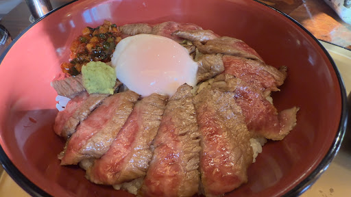 ・ご飯は丼たれを軽く掛けて少し炒めた感じで、濃すぎず薄くない絶妙な味加減でした。これだけでも十分美味しく食べれると思います。(一応、テーブルには追加用の丼たれが置いてあります) ・お肉は当然のあか牛で、とろけるような舌触り・食感を生かしつつ塩程度のシンプルな味付けで焼いた感じ。肉の表面の焼いた硬さと塩加減、中味のとろける食感が何とも言えないくらいマッチしてて『熊本のあか牛を味わっている』という満足感で満たしてくれました。 ・丼にはワサビと薬味(何と言うか知りませんが、キムチ風味のような豆板醤のような少しピリ辛めの味付け)と温泉卵風味な半熟卵が入っており、ワサビ+肉で刺激的な味を楽しんだり、薬味+肉でマイルドな辛味でポリポリとしか食感と肉のとろける食感を味わったり、全てを一緒に味わうことで辛味・甘み・しょっぱさを一度に味わいつつ、お肉の旨味を一緒に味わったりと、しっかりと丼の風味を活かしてくれます。 (ご飯との相性については、説明不要なレベルで相性抜群です!) ・卵を食べるタイミングは『最後に全てかき混ぜる感じで食べる』のが店員さんから聞いたオススメでした。最初に崩しちゃうとそれぞれの良さを味わえなくなってしまいますものね。 味わい尽くした後にオススメの食べ方で食べてみると、黄身の濃厚な味とトロみが全てに追加れることによって、自分を満たしてくれる感覚が味わえました。 『この特別な丼が終わるのか』という感動のフィナーレのような、良い映画エンドロールを見てるような、形容し難い特別な感覚でした。