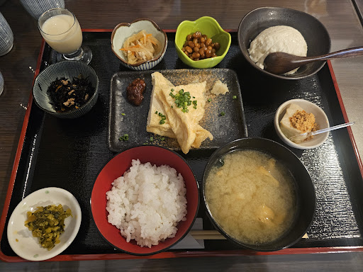 豆乳甘酒、生揚げ、寄せ豆腐、ひじき、大豆煮豆、切干大根、高菜漬け、味噌汁、ご飯